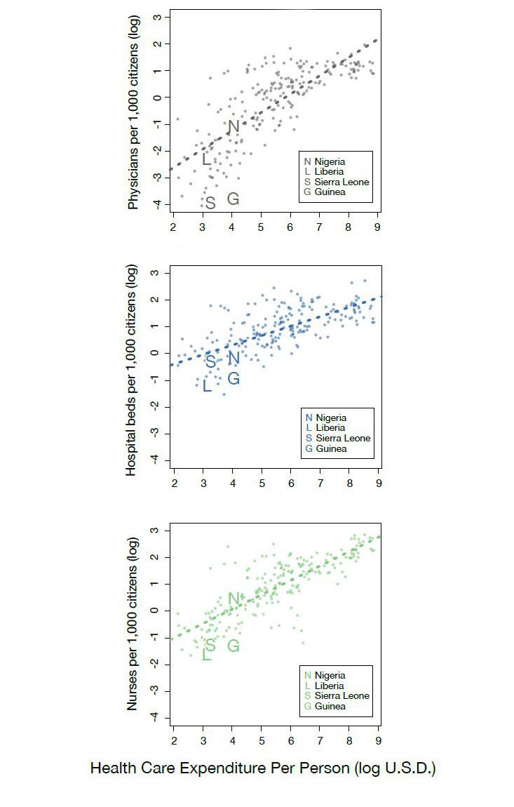 This suggests a complicated picture, whereby Guinea, Sierra Leone, and Liberia appear less adept at translating healthcare spending into healthcare infrastructure. Part of the explanation likely stems from government corruption, a category where all three countries rank in the bottom half of countries as ranked by Transparency International. However, Nigeria, which has a more successful track record of turning money into infrastructure, has a dismal corruption rank, well behind Sierra Leone’s and Liberia’s, and only marginally ahead of Guinea’s. It is likely that there are numerous other factors that hinder these countries’ efforts to translate spending into beds and healthcare workers, with one especially significant example being the devastating effects of recent civil wars.