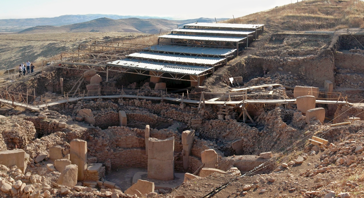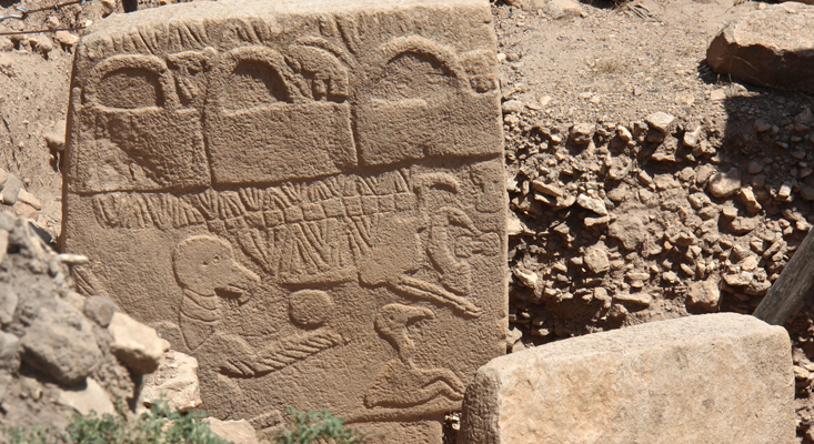 Archaeologists there have been studying a 15-meter-high mound called Göbekli Tepe—“Potbelly Hill.” The area is packed with prehistoric pillars and enclosures, including a layer of large circles, up to 20 meters across, dating to the tenth millennium B.C. Up to 12 T-shaped pillars around the edge of each space were connected by a stone bench. Two more giant pillars—up to 5.5 meters high and each weighing several tons—stood parallel in the center, with traces of carved arms, belts, and loincloths made of animal skins. Other stones are covered in carvings of animals: spiders, scorpions, vultures, foxes, boar, gazelles. It is the earliest great stone monument known and a staggering 6,000 years older than Stonehenge.