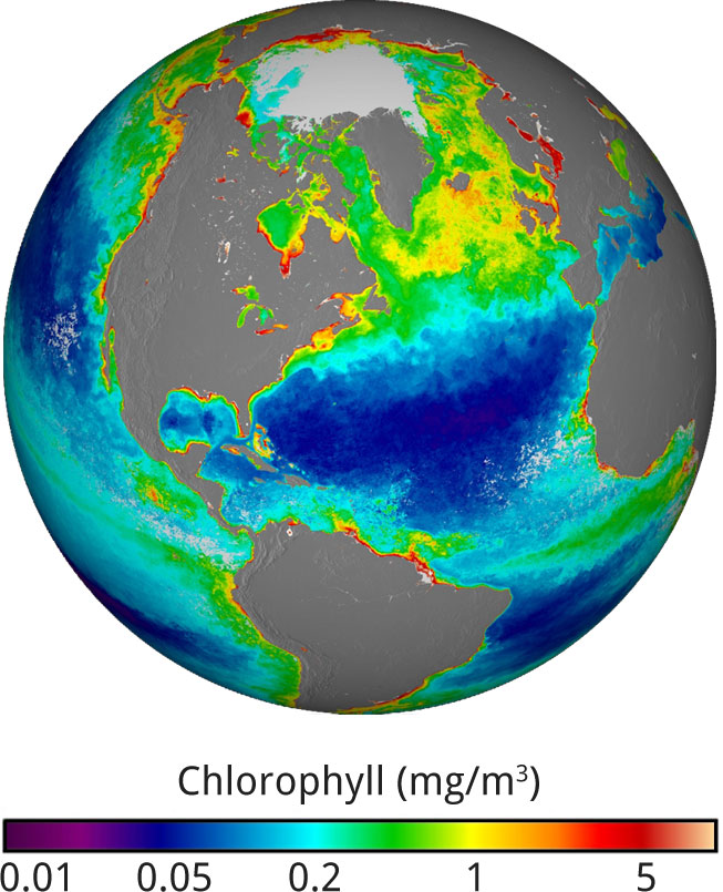 The key to answering this question lies in the recognition that the Earth’s physical environment and the life it supports continuously interact as a closely coupled system. The core of this interaction is the carbon cycle. Plants and microorganisms, both on land and in the surface layers of the ocean, take carbon dioxide from the atmosphere and “fix” the carbon in organic matter through the process of photosynthesis. Other organisms—most importantly microbes, but also animals and people—metabolize organic matter, releasing carbon back to the atmosphere, a process known as respiration. But while photosynthesis is visible in the greening of leaves and the spectacular algal blooms on the ocean surface (see illustration of ocean chlorophyll concentrations), respiration is neither visible nor well understood. That’s because respiration occurs in different places and at very different timescales. In the ocean’s surface layers, for example, respiration happens fairly quickly—minutes to months. A small percentage of organic matter escapes degradation and drops slowly to the bottom of the ocean, becoming buried in the sediments, where respiration can take thousands of years. So over time, lots of organic carbon accumulates at the bottom of the ocean. And some of that gets embedded in sedimentary rocks, where the effective timescale for respiration can be many millions of years. Virtually all of the fossil fuels we burn—oil, coal, natural gas—come from that latter reservoir of organic carbon.