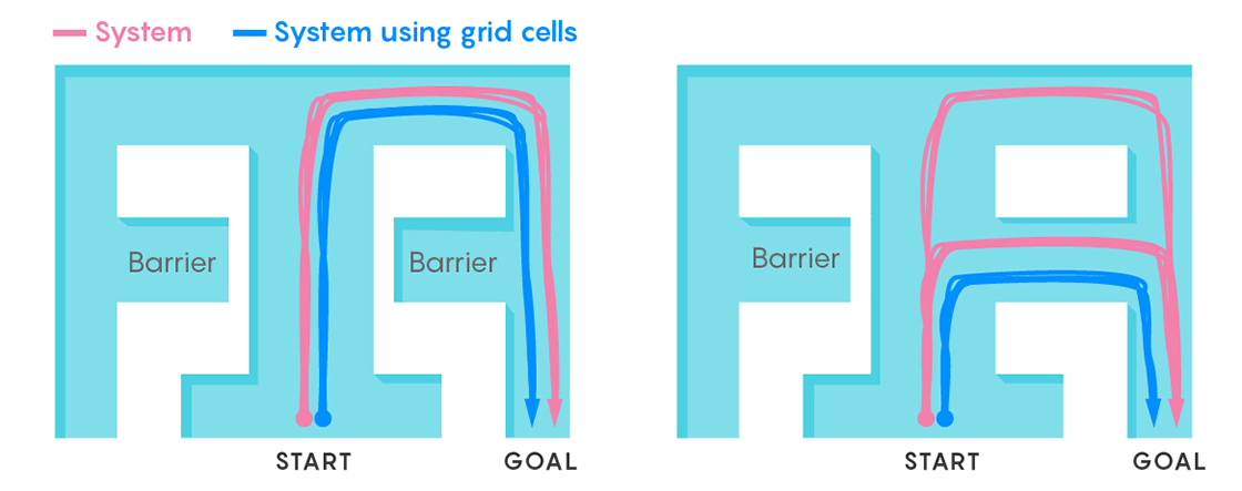 The research team then joined the neural network’s abilities to systems that helped simulated agents find their way through mazelike virtual environments to goals. The system with grid units was far superior to systems without: For example, the system could tell if a previously closed door offered a shortcut to the goal, and it would take that route preferentially. According to Banino, this knack demonstrated that the grid units in the neural net were performing vector-based navigation because they were identifying a shorter, more direct route based on knowledge of the goal’s position.