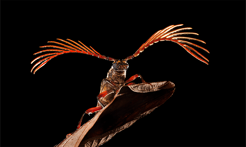 Male longhorn beetles of the genus Cyriopalus, such as the one pictured here, sport unusually massive antennae. About as long as their bodies, these feathery feelers allow the beetles to detect faint chemical cues in their environment, leading them to attractive mates and to the plants they eat. While many longhorn beetles—also known as longicorns—have unbranched antennae, the more complex branched versions that some species display may be more sensitive because they have greater surface area.