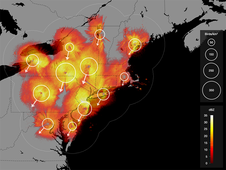 In Ithaca, New York, a virtual machine in a laboratory at the Cornell Lab of Ornithology sits in the night, humming. The machine’s name is Bubo, after the genus for horned owls. About every five minutes, Bubo grabs an image from Northeast weather radar stations, and feeds it through a pipeline of artificial-intelligence algorithms. What does this radar image show me? Bubo asks. Is it rain? Are these insects? Could it be pollen? Bubo doesn’t care about those things; all it wants to see are birds in flight. To find them, Bubo analyzes the velocity and direction of targets seen by the radar station. Bubo knows birds have a velocity different from wind and insects, and filters those out. Now Bubo sees only birds. But how dense are they? How fast are they going? How high in the sky are they flying? The machine makes these calculations and creates an image of countless birds in flight, traveling under cover of darkness.
