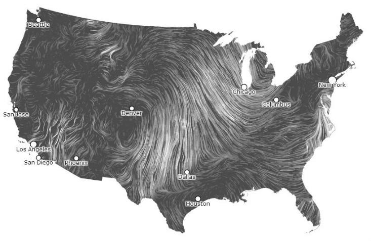 Other artists are also working to meaningfully show otherwise invisible environmental data. Wind Map, another part of the Sensing Change exhibit, is a living portrait of wind speed and direction across the United States. Created by computational designer Fernanda Viégas and computer scientist and artist Martin Wattenberg, its striking visualization is based on data from National Digital Forecast Database and is updated every hour. Viégas and Wattenberg say they are pushing the boundaries of how to use new forms of data visualization in their collaborative work, including their co-leadership of Google’s Big Picture data visualization group.