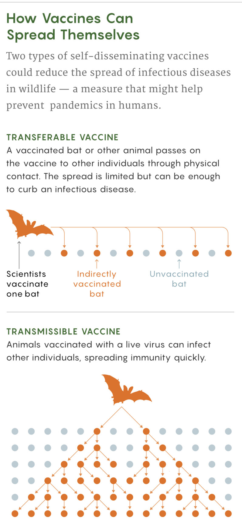 A transferable vaccine can be given to a bat, for example, as a paste on its fur. Upon the animal’s return to its colony, other bats would groom it and get exposed to the vaccine too. The spread of this type of vaccine would be limited, but in Nuismer and Bull’s models, transferable vaccines could achieve high enough levels of immunization to potentially eradicate pathogens in wild populations.