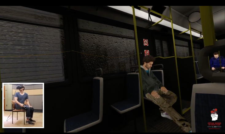 You wake up on a bus, surrounded by all your remaining possessions. A few fellow passengers slump on pale blue seats around you, their heads resting against the windows. You turn and see a father holding his son. Almost everyone is asleep. But one man, with a salt-and-pepper beard and khaki vest, stands near the back of the bus, staring at you. You feel uneasy and glance at the driver, wondering if he would help you if you needed it. When you turn back around, the bearded man has moved toward you and is now just a few feet away. You jolt, fearing for your safety, but then remind yourself there’s nothing to worry about. You take off the Oculus helmet and find yourself back in the real world, in Jeremy Bailenson’s Virtual Human Interaction Lab at Stanford University.