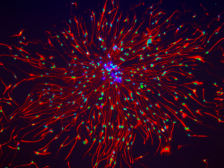 doomed journeys: Brain cancer cells (above) might one day fall victim to the cues that beckon them to new homes.Biplab Dasgupta, Jane Anderson, Shabnam Pooya, Mariko DeWire, & Lili Miles; Courtesy of Nikon Small World