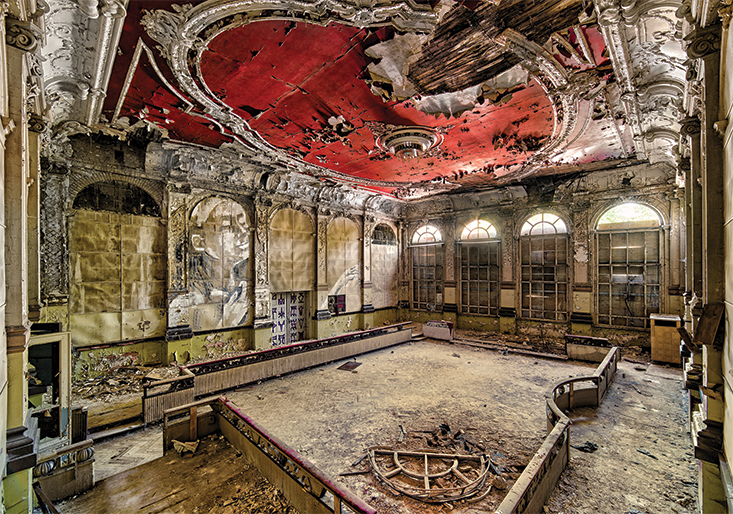 We leave the car on a side street and scale a chain-link fence, alighting in a muddy field of grass, out of breath. We climb through a broken, arched window and emerge into the sanatorium’s grandiose atrium. In the empty, silent hall, I feel what Ulrike means. What was once a working hospital, swarming with nurses and doctors tending to wounded soldiers, has lain abandoned for more than 50 years—declared waste, left to wither and rot away. We are witness not just to the passing of time and gradual decay, but to the discarded dreams of a different era, represented in what remains of its opulent architecture. It is a link to the past that feels both distant and immediate.