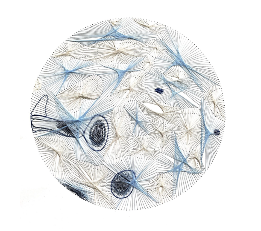 The dynamic movement of ocean water plays a role in species diversity and distribution. The swirling of water into currents that flow in a somewhat circular motion are known as mesoscale eddies with the rotation dependent on the temperature and salinity of the water masses inside and outside the eddy. Focusing on eddies located in the region where our expedition was exploring, I worked with the scientists to embroider on paper the estimated averages of these eddies. Using the gradient numbers calculated that characterize the Bell curve for each eddie. I created a stitching pattern sequence with cooler tones stitched counterclockwise for eddies under the sea surface, and warmer tones stitched clockwise for eddies above.