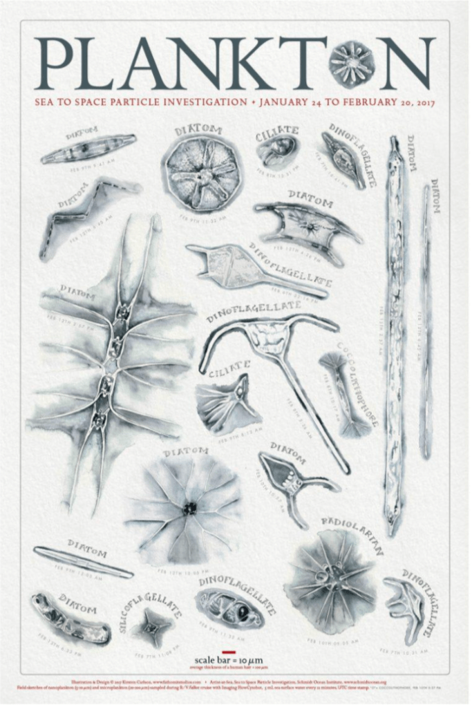 Field sketches of nanoplankton (5-20 µm) and microplankton (20-200 µm) sampled during R/V Falkor cruise with Imaging FlowCytobot, 5 mL sea surface water every 22 minutes, individual plankton identified with UTC time stamp.