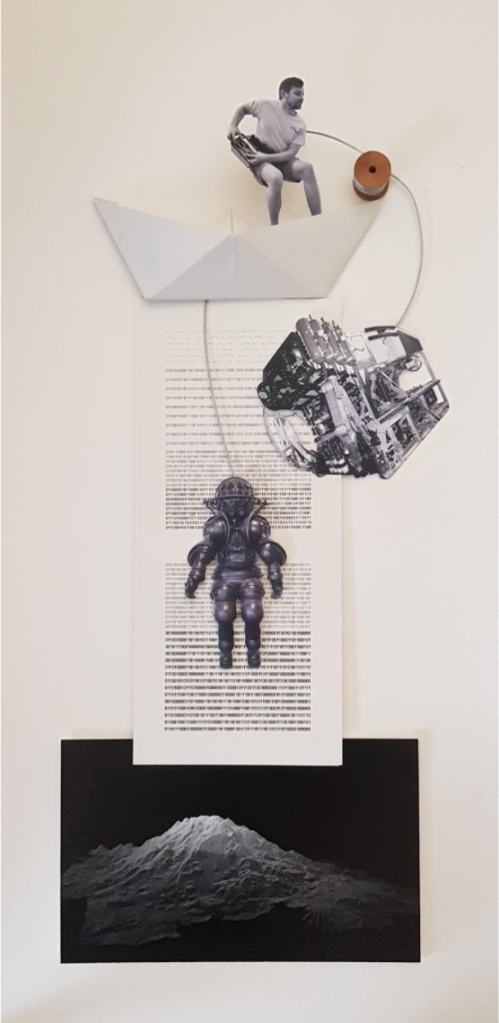 IIn the background there is Morse code as well as binary code which are translations from the "Neverending Story". The variations within the text also reference the various atmospheres of the ocean (Epipelagic - Hadopelagic). The paper boat taps into the spirit of innovation and imagination. At center is a copy of the first underwater anthrophomorphic dive suit. It is juxtaposed to a copy of SuBastian to show the evolution in oceanographic apparatuses. They both sink lower toward a wireframe render of the second sea mount mapped during our Pacific expedition.