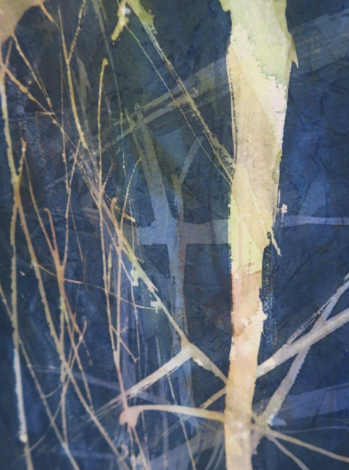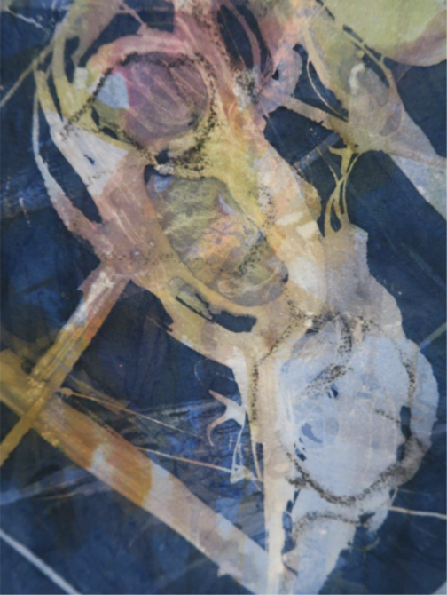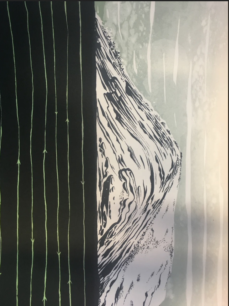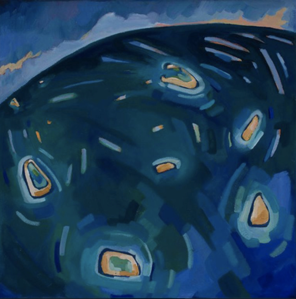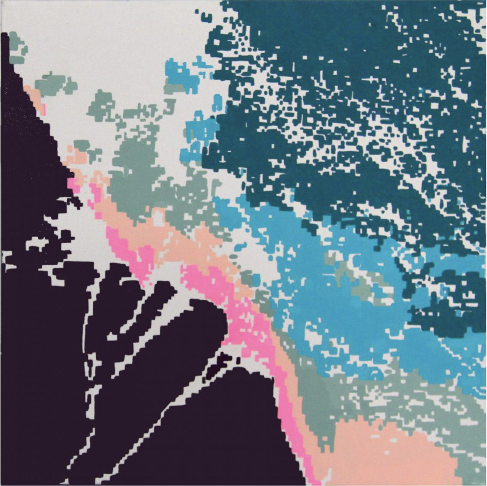This work reflects on the mapping lines that are slowly making the unseen places beneath the oceans seen. The journey taken by the R/V Falkor to Kenn Reef is highlighted, with other mapping lines adding depth, the dominate colour is a blue/turquoise with splashes of oranges and light greens.