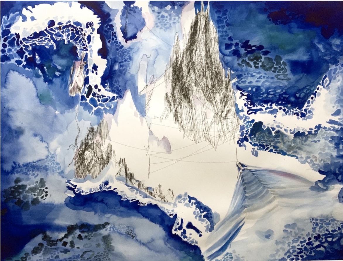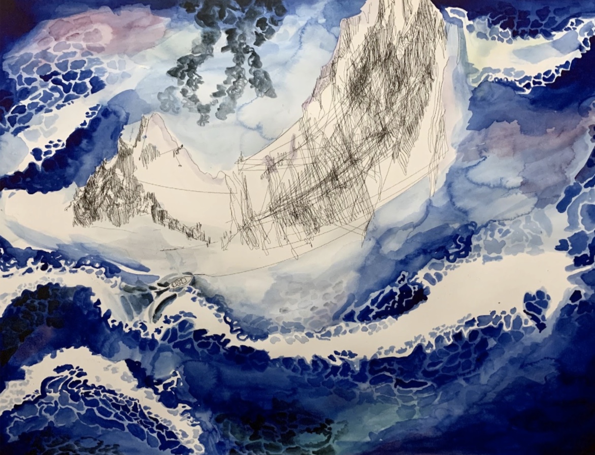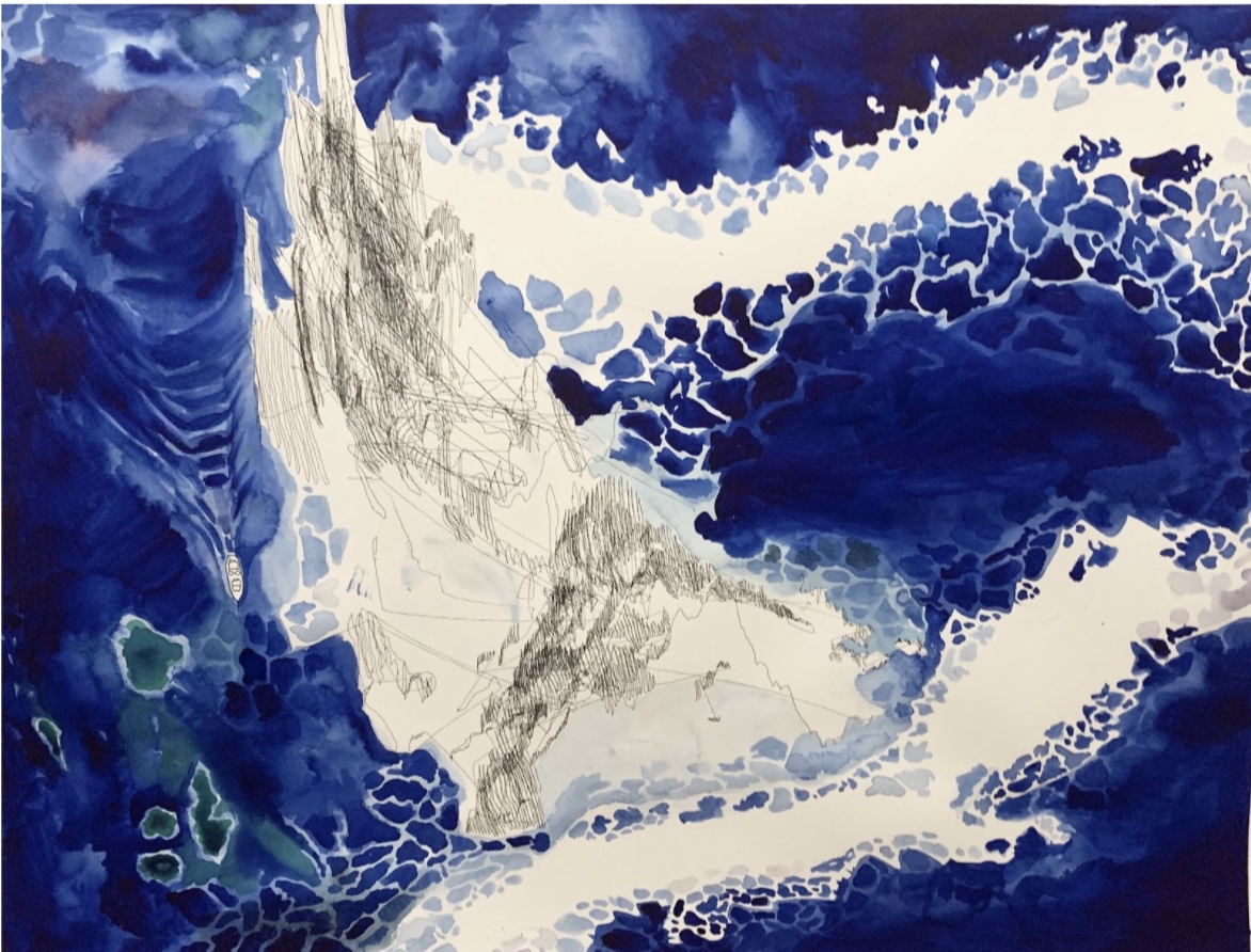 To translate it into art, I thought about the difficulties of drawing in a moving vessel when a drawing requires precise lines. During the first leg of the cruise, I learned about bathymetry geology and how geologists interpret maps. The beauty of the maps that translate the bathymetry data done by the vessel's path made me think about the course of drawing and how both make visible the invisible.
