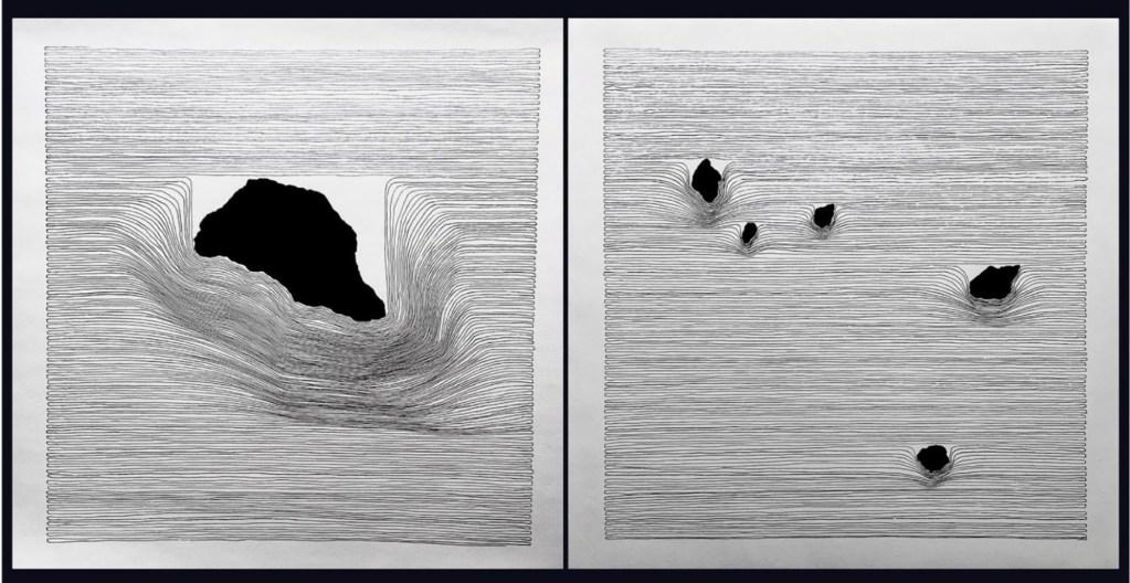 Exploring the process, without being onboard of R/V Falkor, I decided to do the drawings in the nearest waterbed I could find where I live. That was at Xochimilco in Mexico City. In a moving chinampa, I draw each artwork with the difficulties of a moving vessel and the heat of the Sun drying the ink faster than expected.