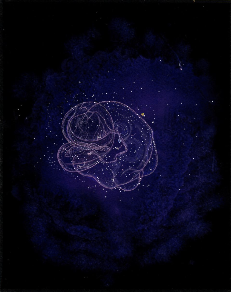 Ctenophore (Comb Jelly) floating in the deep open ocean at the breathtaking San Juan Seamount 1450 Meters depth. Ctenophores are invertebrate animals which swim by using cilia. Despite its common name, Ctenophores are not jellyfish. This Ctenophore, beautiful and ethereal, appears as a starry galaxy floating in a vast space.