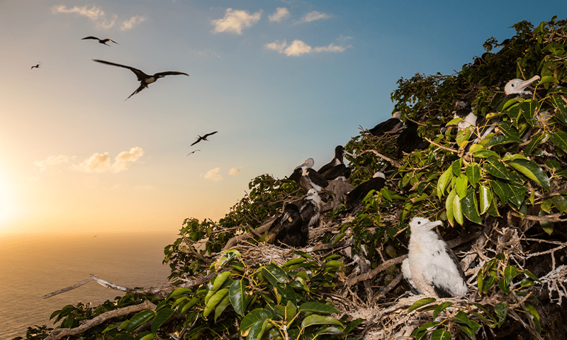 My second moment came when there was a visiting party of British Members of Parliament coming over to the Chagos Archipelago and I was hosting them. I took them out to this island group called the Three Brothers. We were in a small craft, sailing toward the Three Brothers at dawn. And one of the MPs tapped me on the shoulder and said “I think that island’s on fire!” And it wasn’t fire at all—it was seabirds leaving the island at dawn to go out into the ocean to fish. There were red-footed boobies leaving the side of the island like rapier missiles and there were frigate birds circling up above like a cloud of smoke and noddies flashing all around us. And I said, that’s not smoke, that’s seabirds leaving a pristine island.