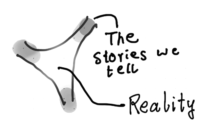 Even more dramatic are dualities involving the force of gravity. On one side, we have theories of matter and all the forces except gravity; on the other, we have theories of matter and forces including gravity. These theories look very different. They are couched in terms of different forms of matter, different types of forces, and even different numbers of spacetime dimensions. Yet they describe precisely the same fundamental physics. So, what is “real” here? If one theory says the force of gravity operates and the other says it doesn’t, what do we conclude about the reality of gravity? Perhaps we can use my sketch to visualize the situation—we are able to tell stories about the corners of this diagram of possible worlds, where simplifications and approximations suffice, but the categories and concepts that we have been capable of, at least to date, fail to describe the interior where reality is actually located.