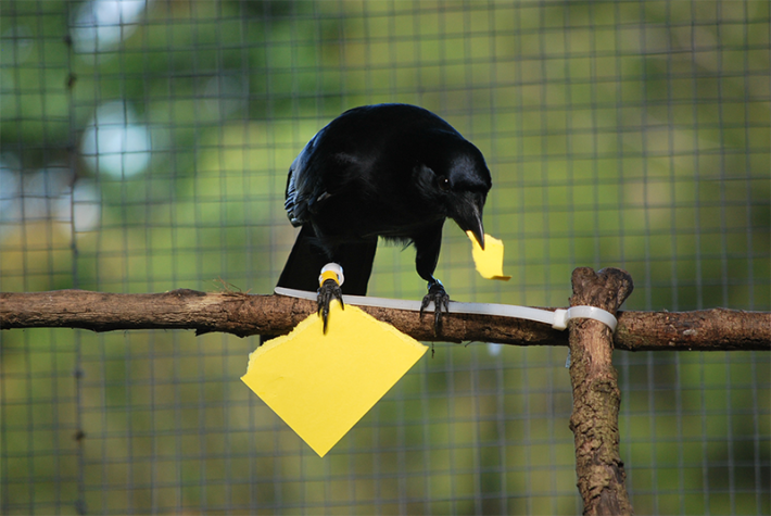 For their study, Jelbert and her colleagues first trained three hooded crows—Glaz (15 years old), Rodya (4 years old), and Joe (3 years old)—to recognize pieces of paper of different sizes and colors. To do this, they exposed the birds to “template” pieces of paper in different colors and sizes for several minutes before removing them—and then rewarded the birds for dropping scraps that matched these templates into a small slit.