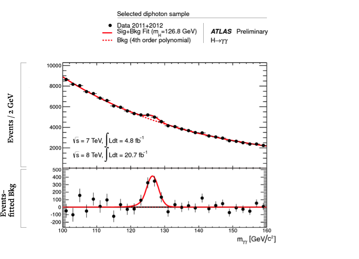 We are able to accomplish analyses like this with enormous computing power: About a billion megaflops of power are dedicated to filtering alone. And, for discovering the Higgs, it worked beautifully. After filtering, we brought to bear a vast computer network of about 100,000 processors distributed in computing centers around the globe. For each collision, we calculated the mass of the parent particle from the combined mass of the observed decay particles (among other quantities). In most cases, we were wrong to do so, because the decay particles did not actually issue from a single parent. This means the mass we calculated was essentially random, producing a background distribution to our measurements. Occasionally, however, the observed decay particles did come from a single parent particle, such as a Higgs boson decaying into two photons. By accumulating enough data, we saw a “bump” at the unique mass of the Higgs boson, sitting on top of a smooth falling background distribution from all the “wrong” pairs for which we had calculated a mass. That bump was at a mass of 125 GeV/c2, as illustrated below.