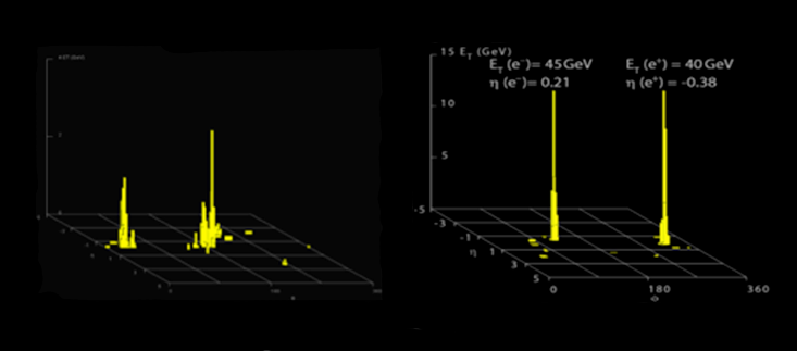 The picture on the left is of two quarks produced in a proton-proton collision, which is very common and not especially interesting. The quarks turn into “jets” of particles that are represented by the two yellow towers. The right-hand picture shows a Z boson decay into an electron and a positron (the anti-particle of an electron), which is much more rare, and much more interesting. It could be a sign of unexpected physics, because it suggests that the Z boson is as heavy as 90 protons (in fact not too different from the mass of a Higgs boson). But on a cursory examination, the two pictures appear very similar: two towers of yellow.