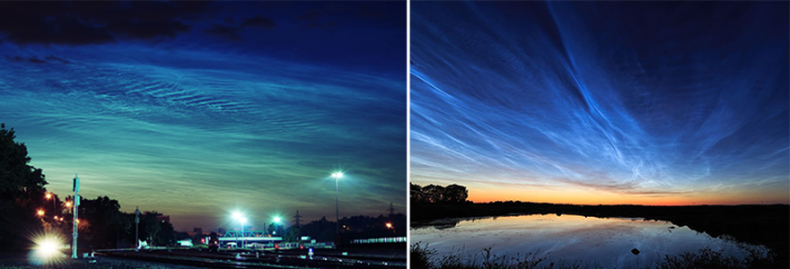 They swirl at the very edges of our atmosphere, forming paper-thin ripples that glow electric and pearl blue. They’re lit by a twilight sun catching on ice crystals and seeded by rocket exhaust and space dust.