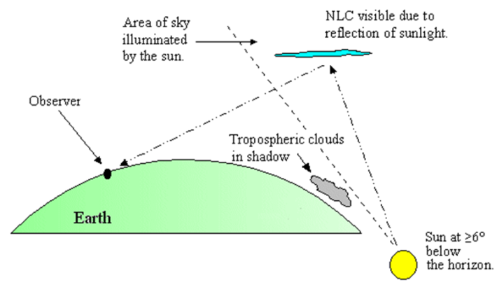 Noctilucent clouds live about 50 miles above the Earth’s surface, at the outer reaches of a layer of atmosphere called the mesosphere, where meteors typically burn up. The mesosphere lies just above the stratosphere and below the thermosphere, where auroras occur. Paradoxically, the mesosphere is colder in summer than in winter, reaching temperatures as low as -100 degrees Celsius. It is also very dry. The extreme low temperatures allow what water vapor exists to condense on dust and other particles, forming tiny ice crystals that scatter sunlight, giving the clouds their incandescent glow.