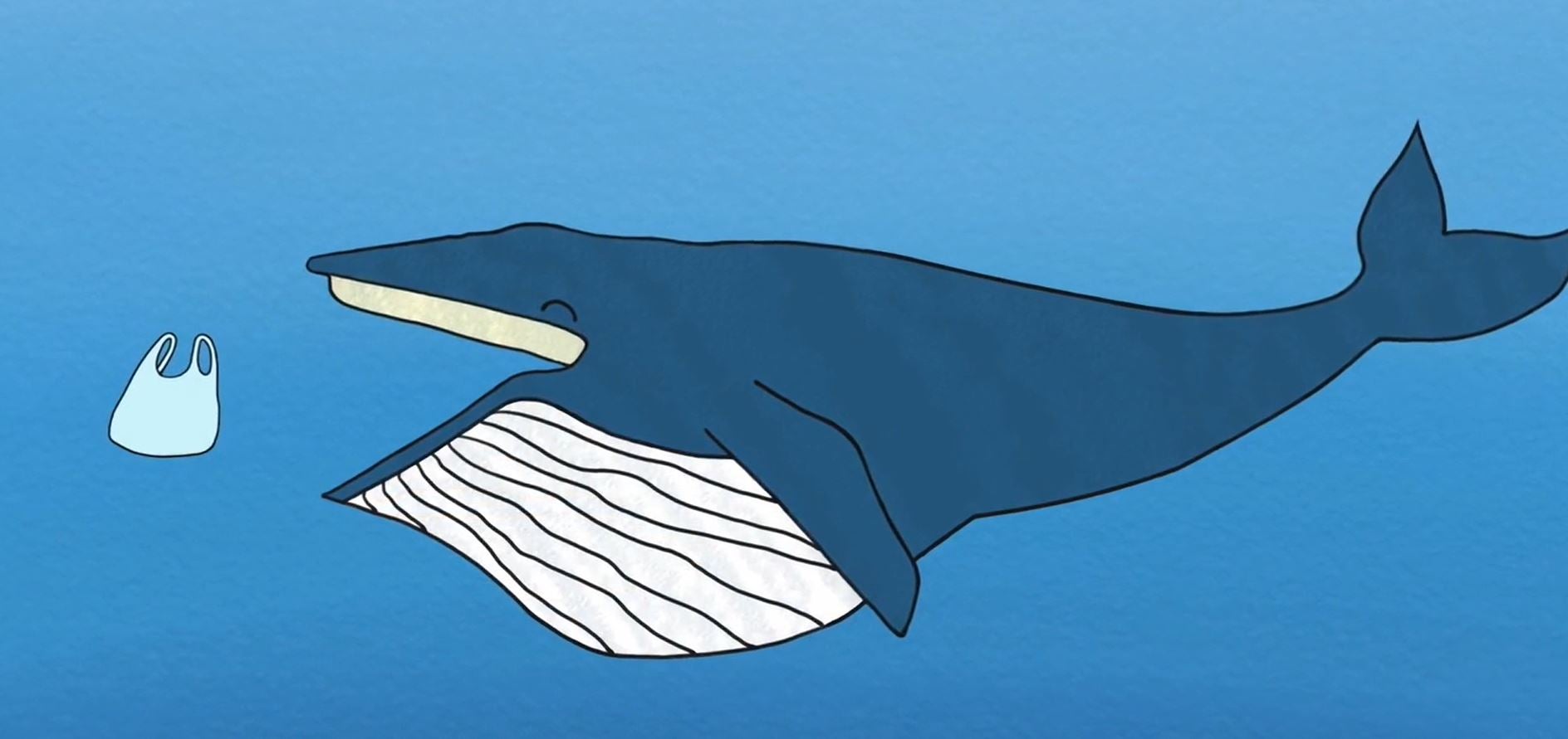 Vowles’ observation becomes an existential question as the beach fades. “It’s just one piece of trash” repeats in thought balloons that circle an illustrated Earth. Simple, highly graphic animated sea creatures come on screen in bright and cheerful colors. But as a whale swallows that trash—as do a turtle, an otter, a seagull, and a fish—all those single pieces of refuse add up to collective disaster. The illustrations highlight the contents of the animals’ stomachs and their outlines darken. We are poisoning wildlife—they are literally eating our garbage.
