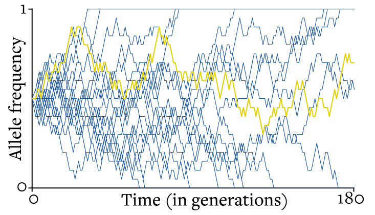 One population is highlighted in yellow to show what a single walk looks like. After 180 generations, all but three of the different random walks have hit zero or 1 and stuck there. Given time, the remaining walks will do the same. Because the size of the steps in a random walk is inversely proportional to population size, small populations tend to bump into an absorbing state faster than do large ones. Any finite population, though, will eventually end up at zero or 1.