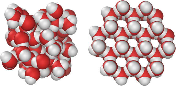 The remarkable variety of crystalline ice forms results from the tetrahedral network of strong hydrogen bonds formed among neighboring water molecules. In the condensed phases of water, each molecule optimizes its hydrogen bonding capacity by forming four hydrogen bonds at near-tetrahedral angles. The hydrogen bonds inside Ice Ih form an open, three-dimensional structure with a low density.