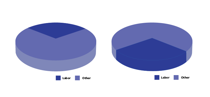 Both of these pie charts show “labor” taking up 30 percent of some total. But you probably noticed that the chart on the right makes the labor slice look a lot bigger by positioning it in the foreground, which gives it a thick 3D edge and more than double the number of dark blue pixels than when it’s in the background.