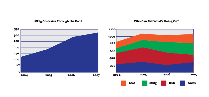 We’re pretty good at noticing trends. But what if there’s one that someone doesn’t want us to see? The left chart clearly shows that marketing costs have tripled over three years. This same fact is there in the right chart, but it’s hidden among a host of other data, softening the impact of the sharp incline in marketing costs, and making that incline nearly impossible to quantify.