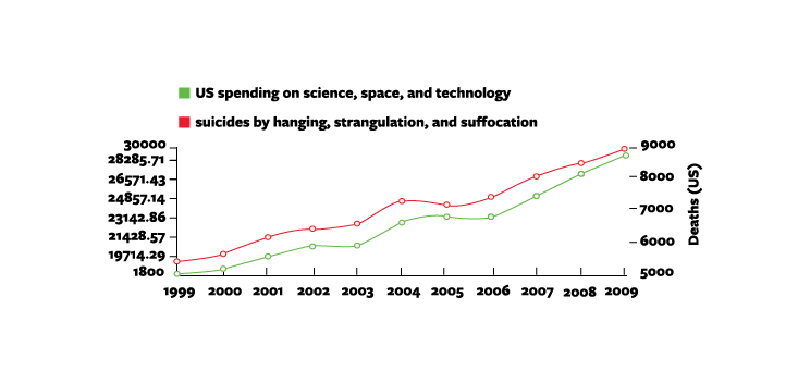 When two or more lines appear together in a chart, and they look similar to each other, we have the tendency to assume they are related. The red line in this chart represents suicide rates while the green line represents spending on science and technology—two completely independent sets of data. But on first glance, we tend to ask ourselves whether there could, in fact, be a causal correlation (if you can think of one, tell us in the comments section below).