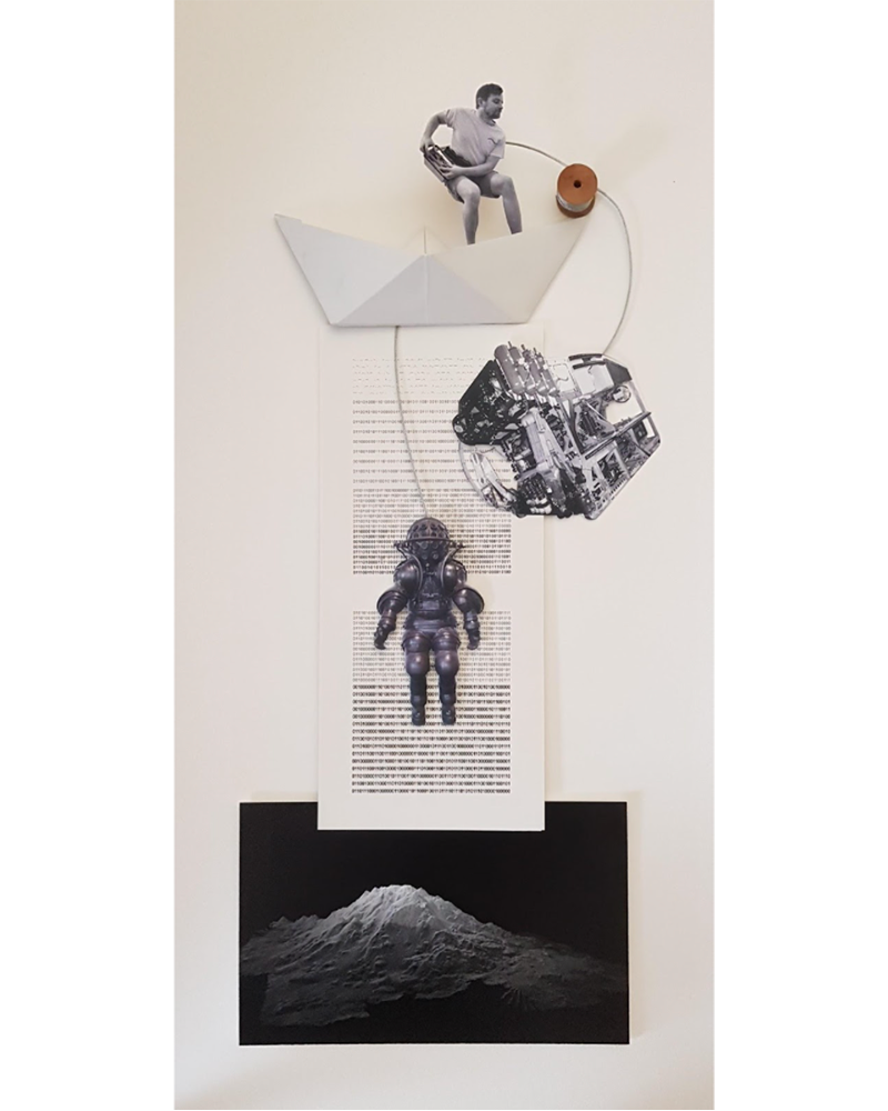 “Fathoming Evolutions of Oceanography -1” is a collage of Munroe’s global and local perspectives. It’s also a personal work. “I grew up playing with paper boats and planes,” he says. “And those are very temporal. You could always throw them away. It’s the same with art. You can roll it up and move on to another idea, maybe a bad idea, maybe a fresh idea.” The paper boat in “Fathoming Evolutions of Oceanography -1” is “literally my experience,” Munroe says. “The paper boat is my imagination. It represents the thought process, the freedom, the whimsical nature at times of creation. The same for the binary code in it. It represents the layering of data that we face today.”