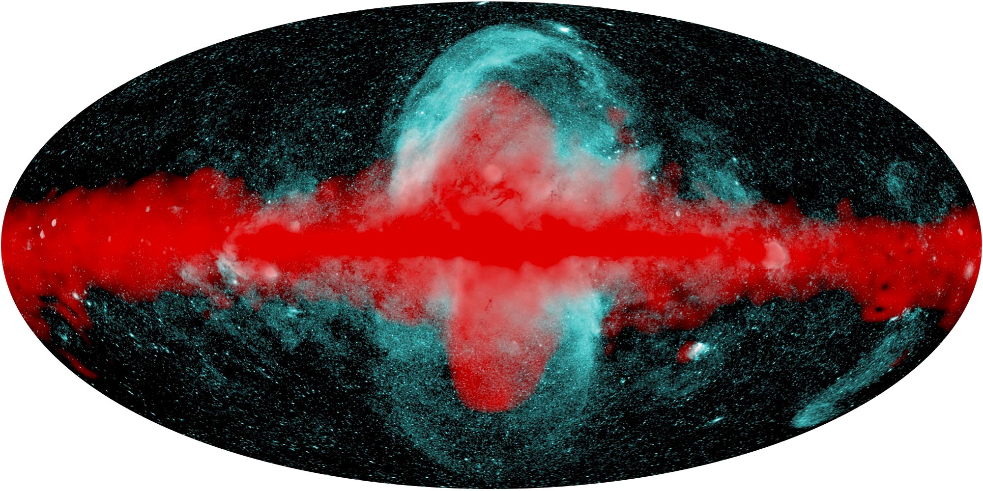 The map traces X-ray bubbles that stand an estimated 45,000 light-years tall, engulfing the gamma-ray Fermi bubbles. Their X-rays shine from gas that measures 3 million to 4 million degrees Kelvin as it expands outward at 300 to 400 kilometers per second. And not only does the northern bubble align perfectly with the spur, its mirror image is obvious as well, just as Sofue predicted. “I was particularly happy to see the southern bubble clearly exhibited, so similar to my simulation,” he said.