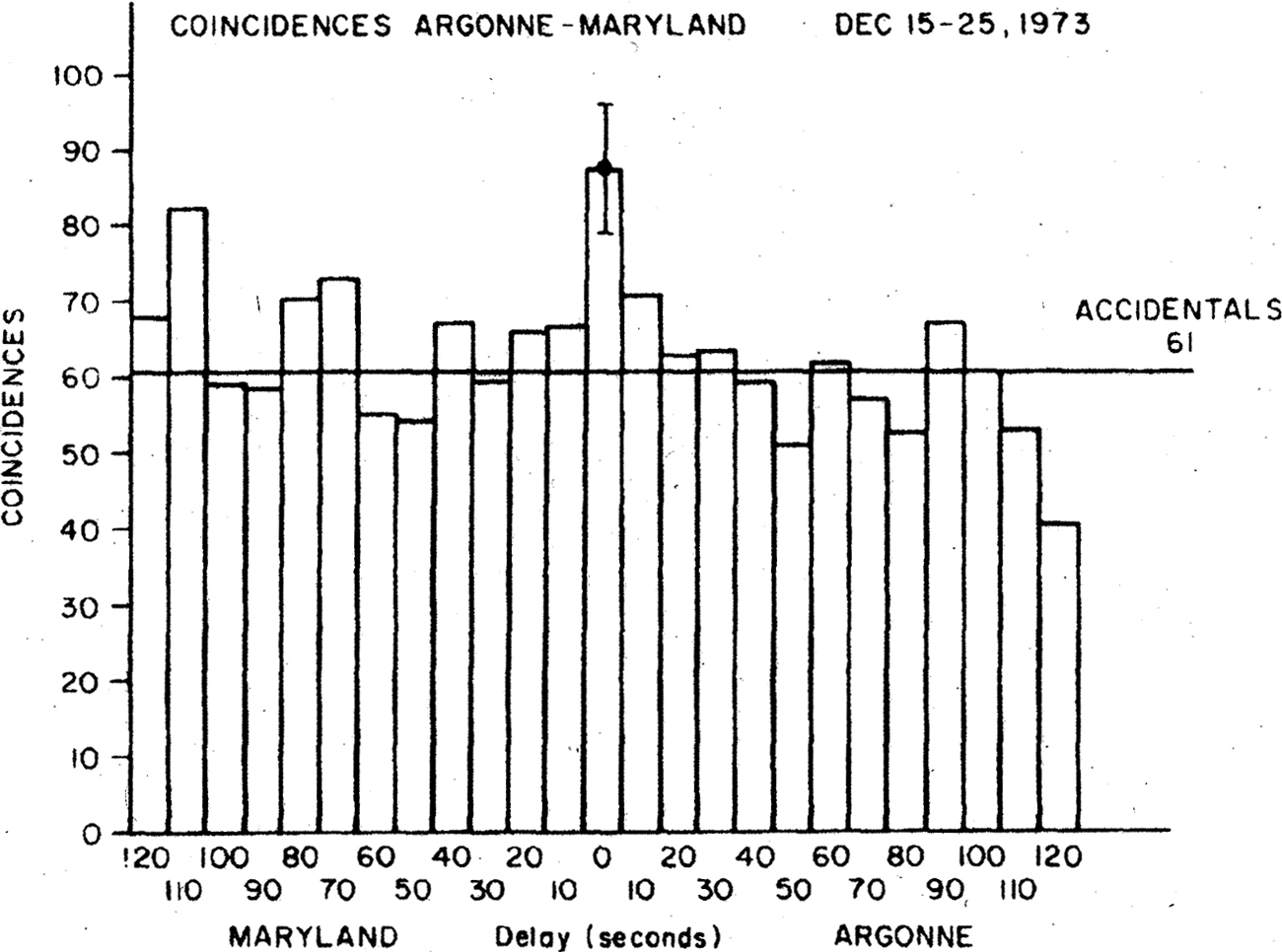 Figures 2–8 show the effects of changing threshold, with the largest accidentals rate ~10,000 [the highest rate] giving a zero-delay excess of 2.1 standard deviations. Raising the threshold and lowering the accidentals rate to 1,069 gives a zero-delay excess of 3.0 standard deviations. ... An accidentals rate 62 of gives a zero-delay excess of 3.0 standard deviations. ... Thus, a variation in accidentals rate by a factor of 16 gives a zero-delay excess exceeding 3 standard deviations, and a range of 4 to 1 in accidentals rate gives a zero-delay excess greater than 4 standard deviations. (Lee et al., 1976, pp. 895–896)