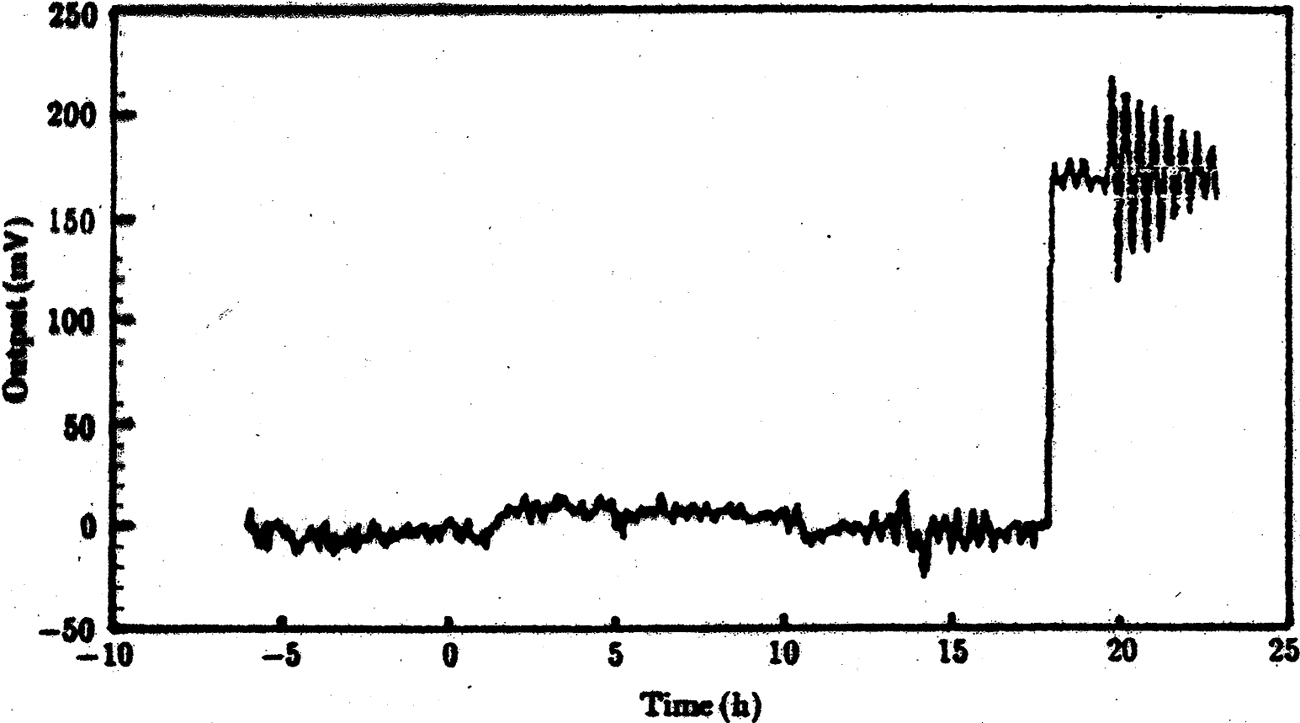 The first of these appeared in 1995 (Luo, Chen et al. 1995). The experimenters noted that Weber had not, in his original paper, given either the stability or the noise level in his torsion balance. “Reanalysing Weber’s experiments, we and that the stability or noise level of the torsion balance has not been given in his paper, this problem is very important and impossible to be neglected. If the total noise level of the torsion balance was comparative [comparable] with the effect predicted by Weber’s theory, his results, of course, would be unacceptable” (p. 137). The apparatus was quite similar to that used by Weber, containing a torsion balance with one target consisting of lead sheets and the other of a single sapphire crystal. The output for their balance is shown in Figure 18. The large jump toward the right-hand side of the figure was a calibration signal. They found that their calibration yielded a result of 1.2 x 10-8 dynes/mV. The average noise level was 6.75 mV, yielding a noise level for the balance of 8.1 x 10-8 dynes. They concluded, “According to the theory presented by Weber, a force of about 5 x 10-6 dynes should be observed by our torsion balance, due to elastic scattering of solar neutrinos. Based on the ratio of 1.2 x 10-8 dynes/mV, the predicted force 5 x 10-6 dynes is equivalent to an output voltage of 417 mV, which was about 60 times larger than the noise level, and should be observed obviously. But, in fact, we did not and any diurnal effect larger that a force of 8.1 x 10-8 dynes” (p. 139).