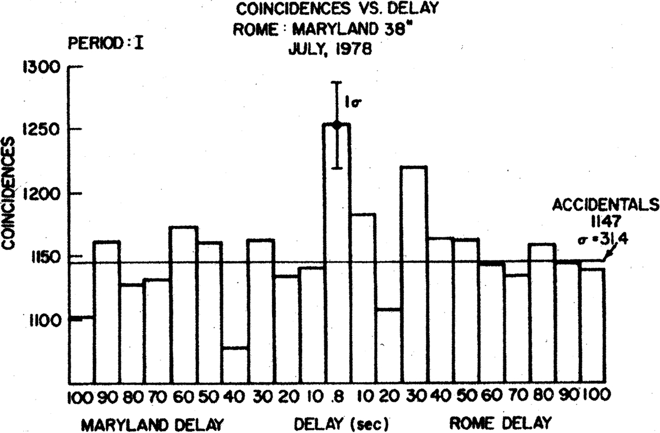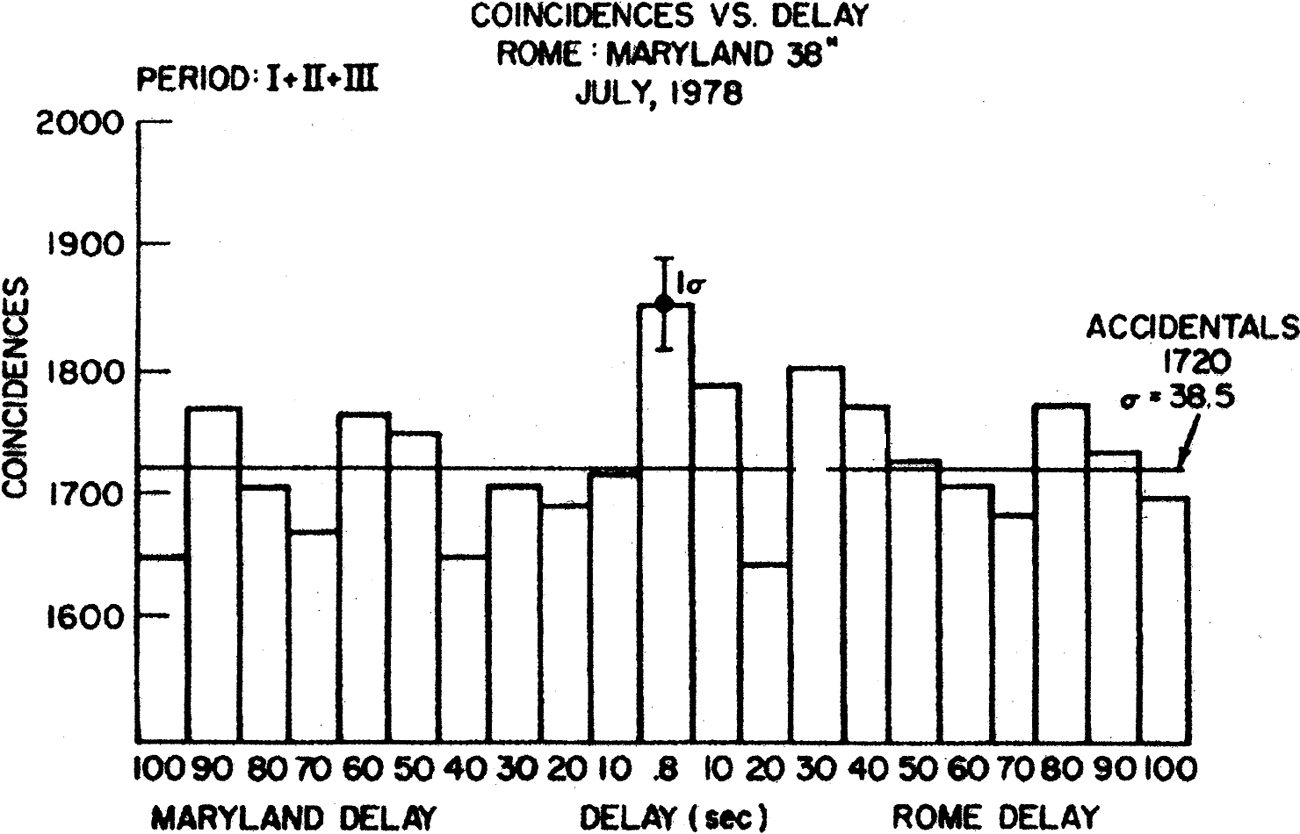 Weber (1984) continued his defense of his gravity wave results, this time invoking the theory of coherent scattering. He remarked that, “For an extended period, other observers were not able to find the background of pulses. However, beginning in 1980, all of the Maryland observations were confirmed” (p. 1187).18 In support of this statement he cited the results of a Maryland-Rome collaboration (Ferrari, Pizzella et al. 1982), of which Weber was a member, and a result from a group at Stanford (Boughn, Fairbank et al. 1982). The Maryland-Rome collaboration concluded that there was a positive signal at zero time delay between their two antennas. “The histograms are evidence for an external background of signals [a real gravity wave signal], greatest during the first period, and having a level of confidence associated with 3.62 standard deviations” (Ferrari, Pizzella et al. 1982, p. 2486). The qualification that the signal was greatest for the first period was important. The group had taken data during the period July 5–13, 1978. They divided that interval into three periods: Period I, July 5–8; Period II, July 8–11; and Period III, July 11– 13. As the group noted, a significant signal (3.56 standard deviations) was seen only during Period I (Figure 4). No significant signal was observed in the other two time periods, although a signal was also seen when the data for all three periods were combined (Figure 5). They also noted that effects of a similar magnitude were seen at non-coincidental times. They remarked, “To summarize, the coincidental effect is observed to be the largest in one of the three periods when these periods are viewed separately. In addition, effects of a similar magnitude are seen at non-coincidental times. When the periods are combined into two contiguous groups, the coincidental effect is the largest in the first group at 3.62 σ with no other delay in either group producing an excess above 3.0 σ. And finally, when all the data are combined, the largest excess is again coincidental” (p. 2479).
