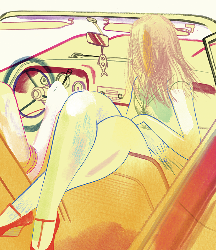 He watched, frozen by the sight of her as she writhed on the seat beside him.