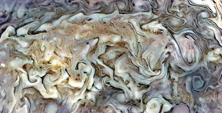 NASA’s mission to explore the origin and evolution of our solar system’s giant is 12 years old and still returning remarkable data and images. This July, the spacecraft Juno completed its 53rd flyby of Jupiter and captured the planet and its moon lo (above), one of Jupiter’s four large “Galilean” moons. (The latest total count of Jupiter moons is 95.) You wouldn’t know it by the placid image, but lo is the most volcanically active body in the known universe, NASA scientists tell us: It’s home to “hundreds of volcanoes, some erupting lava fountains dozens of miles high.” In September this year, Juno beamed back data from Jupiter’s North Pole region. The phantasmagoric image (below) pictures the intricate cloud formations and atmospheric features of the massive planet composed of mostly gases and liquids.