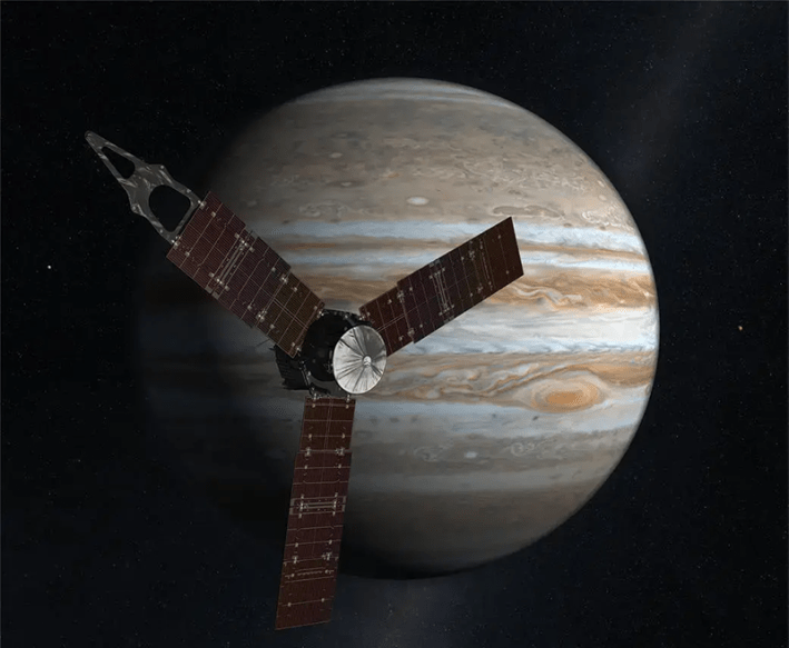 For the record, the image with the spacecraft Juno, below, is an artistic recreation. The image of Jupiter and lo is processed from a raw image taken by the JunoCam instrument, enhancing the contrast, color, and sharpness. The North Pole region image is an artistic recreation of data captured by JunoCam.