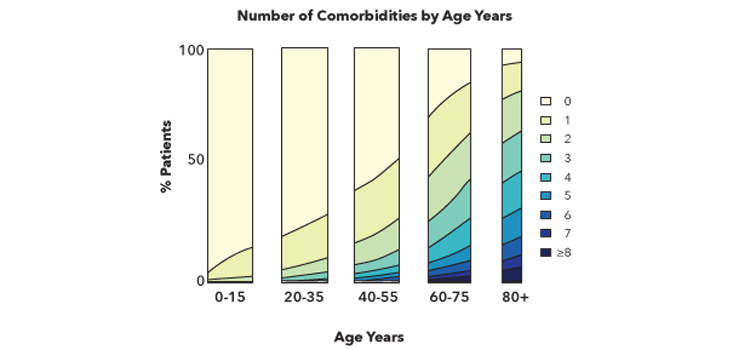 Before breathing a sigh of relief, let’s take a moment to consider the data. As shown in the chart below, reproduced from Aging and the Epidemiology of Multimorbidity,8 almost 25 percent of people have at least one chronic disease by the age of 35. By the time they reach the age of 60, it’s almost 50 percent. By the time they reach 75, it’s 75 percent. These illnesses accumulate with age, and a significant percentage of older individuals battle multiple serious diseases.