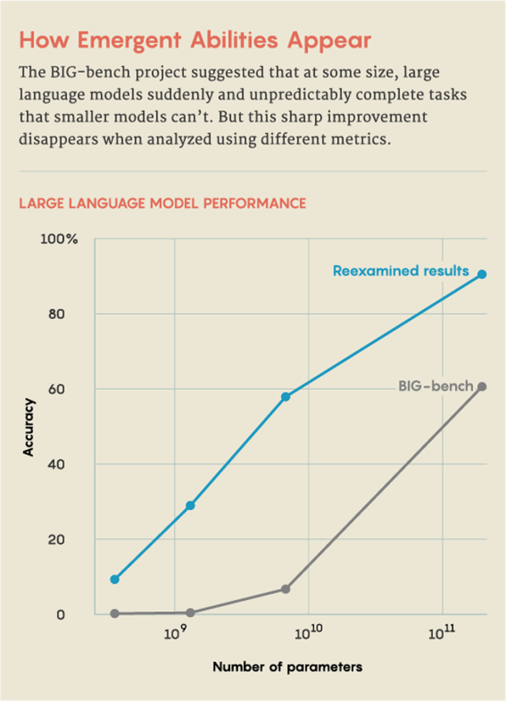 But things may not be so simple. A new paper by a trio of researchers at Stanford University posits that the sudden appearance of these abilities is just a consequence of the way researchers measure the LLM’s performance. The abilities, they argue, are neither unpredictable nor sudden. “The transition is much more predictable than people give it credit for,” said Sanmi Koyejo, a computer scientist at Stanford and the paper’s senior author. “Strong claims of emergence have as much to do with the way we choose to measure as they do with what the models are doing.”