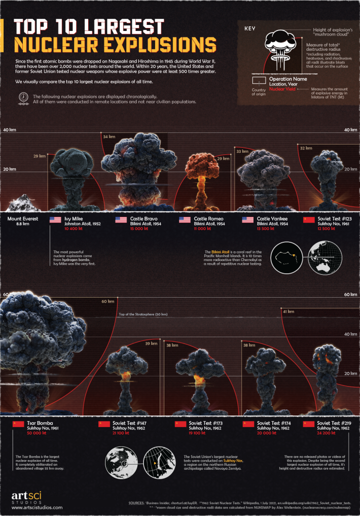 A good example is my infographic on the Top 10 Largest Nuclear Explosions. It is deliberately somber and fiery in accordance with the topic, and has a hint of a military-cross-Virtual Boy™ aesthetic.