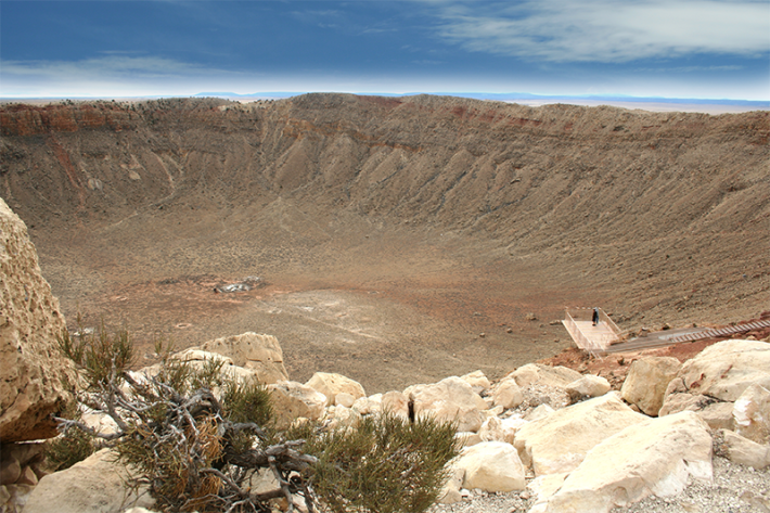 More recently, some 50,000 years ago, a meteorite about 160 feet across (less than half the length of a football field) struck Earth with a velocity of 29,000 miles per hour. The energy released in the collision was equivalent to 600 Hiroshima bombs. Among other cataclysmic effects, the impact could be felt in the form of a 1,000-mph wind blast more than two miles from the site. The crater today, just east of Flagstaff, Arizona, is roughly 560 feet deep and three quarters of a mile across.