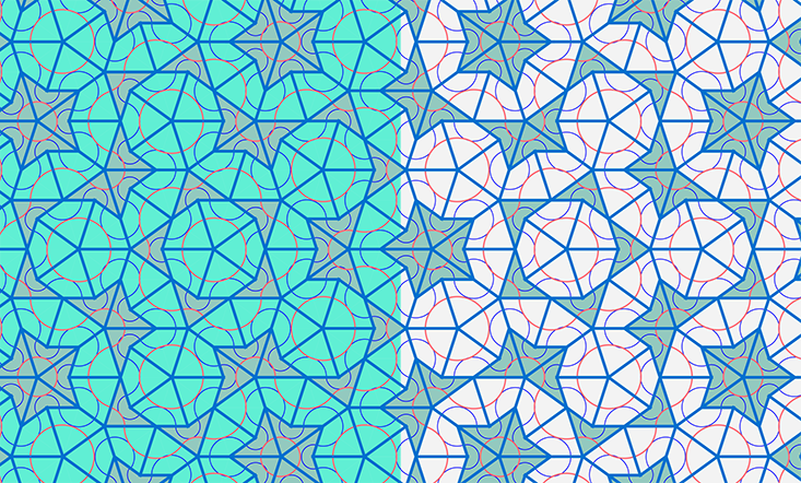 At the heart of their breakthroughs is “forbidden symmetry,” so-called because it flies in the face of a deeply ingrained association between symmetry and repetition. Symmetry is based on axes of reflection—whatever appears on one side of a line is duplicated on the other. In math, that relationship is reflected in tiling patterns. Symmetrical shapes such as rectangles and triangles can cover a plane with neither gap nor overlap, and in an ever-repeating pattern. Repeated patterns are called “periodic” and are said to have “translational symmetry.” If you move a pattern from place to place, it looks the same.