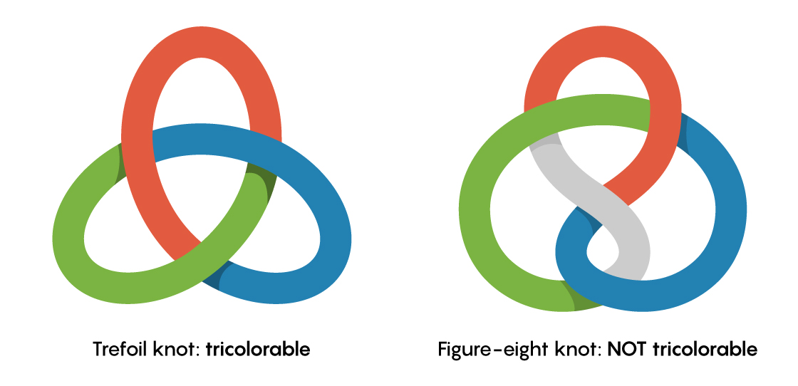 The three-crossing knot known as the trefoil is tricolorable. But the “unknot” (a loop that has no actual knots, even if it appears tangled) is not tricolorable, providing an instant proof that the trefoil is not just the unknot in disguise. But while tricolorability enables us to distinguish some knots from the unknot, it’s not a perfect tool for this purpose: Knots that are tricolorable are definitely knotted, but knots that aren’t tricolorable aren’t definitely unknotted. For instance, the figure-eight knot is not tricolorable, but it is genuinely knotted. This knot falls into tricolorability’s blind spot—it’s as if the invariant is saying, “The figure-eight knot is unknotted as far as I can tell.”