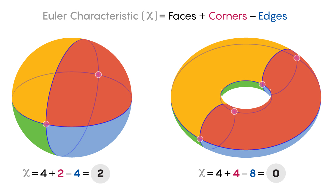 If you wrap a netting around a doughnut surface instead, you always get an Euler characteristic of 0. On a two-holed doughnut, you get −2. The Euler characteristic for surfaces belongs to a series of invariants that allow mathematicians to explore shapes in higher dimensions as well. It can help topologists distinguish between two shapes that are hard to visualize, since if they have different Euler characteristics, they cannot be the same topological shape.
