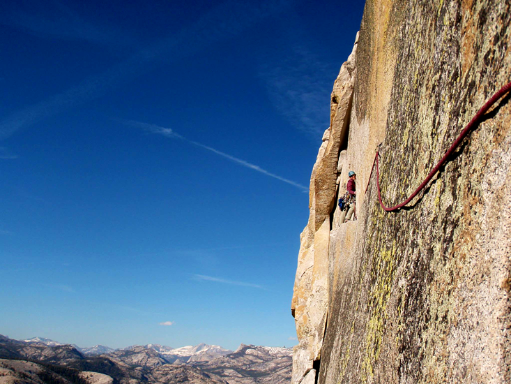 I started climbing. My brain practically shut off as my body took over in the flow of the movement: plug in a piece of gear for protection, sink my fingers into the crack, paste my feet against the granite. I glanced down at how high I was above my last piece of gear in order to gauge how far I would fall before the rope caught me should I slip off—a habit that usually inspired a certain amount of panic in me. This time, however, even though the fall could have been around 20 feet, I felt elated, alive. “Look where we are!” I shouted. “This is crazy! This is so cool!”