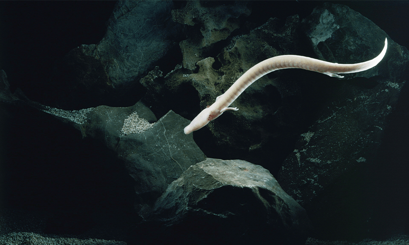 The pale, blind salamander (Proteus anguinus), once thought to be the offspring of dragons, can live for up to a century.* It only lives in deep cave systems, hundreds of feet underground, where light doesn’t reach, in countries across the north Mediterranean and the Balkans. It is long and thin, growing up to about a foot in length, with stunted limbs and a somewhat sedentary lifestyle. It is sensitive to sound, vibrations, pressure changes, temperature, electromagnetism, and the intrusion of light, and it only appears above ground when washed to the surface by high waters.
