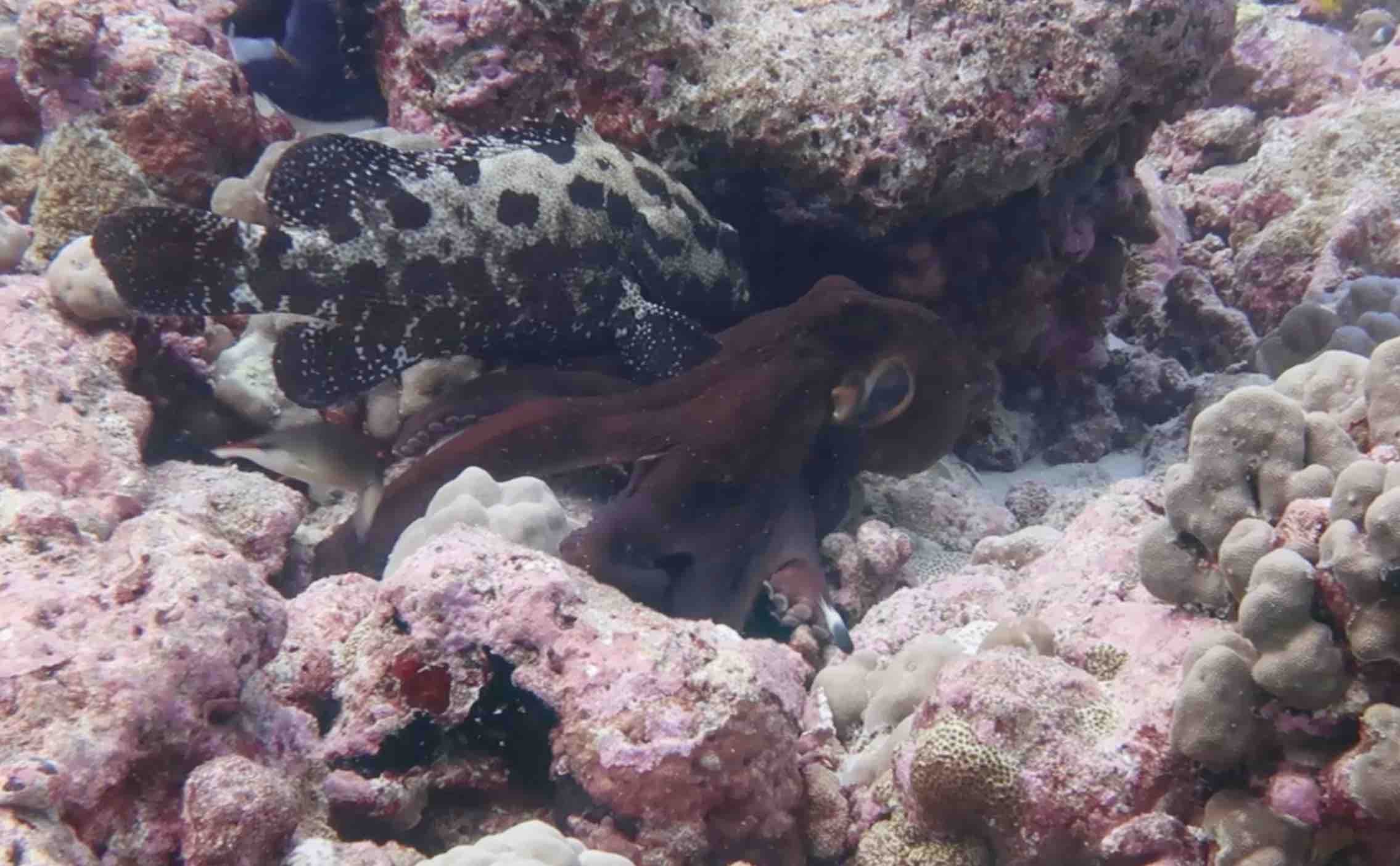 Another fascinating question, he said, is how knowledge spreads of hunting strategies and mutually-understood signals. Perhaps each participating octopus and fish works it out for themselves, through trial and error—or perhaps, following an initial breakthrough, knowledge spreads by observation or even active teaching. That would make it a cultural adaptation, a matter of accumulating knowledge passed between generations, an example of species surviving in a fast-changing world not because of some fortunate genetic mutation but because they are learning. This also suggests a potentially key role for grouper. Unlike day octopuses, who reach a ripe old age at 15 months, brown-marbled and peacock grouper can easily live 40 years or longer. They may be a living library for their short-lived partners.Â