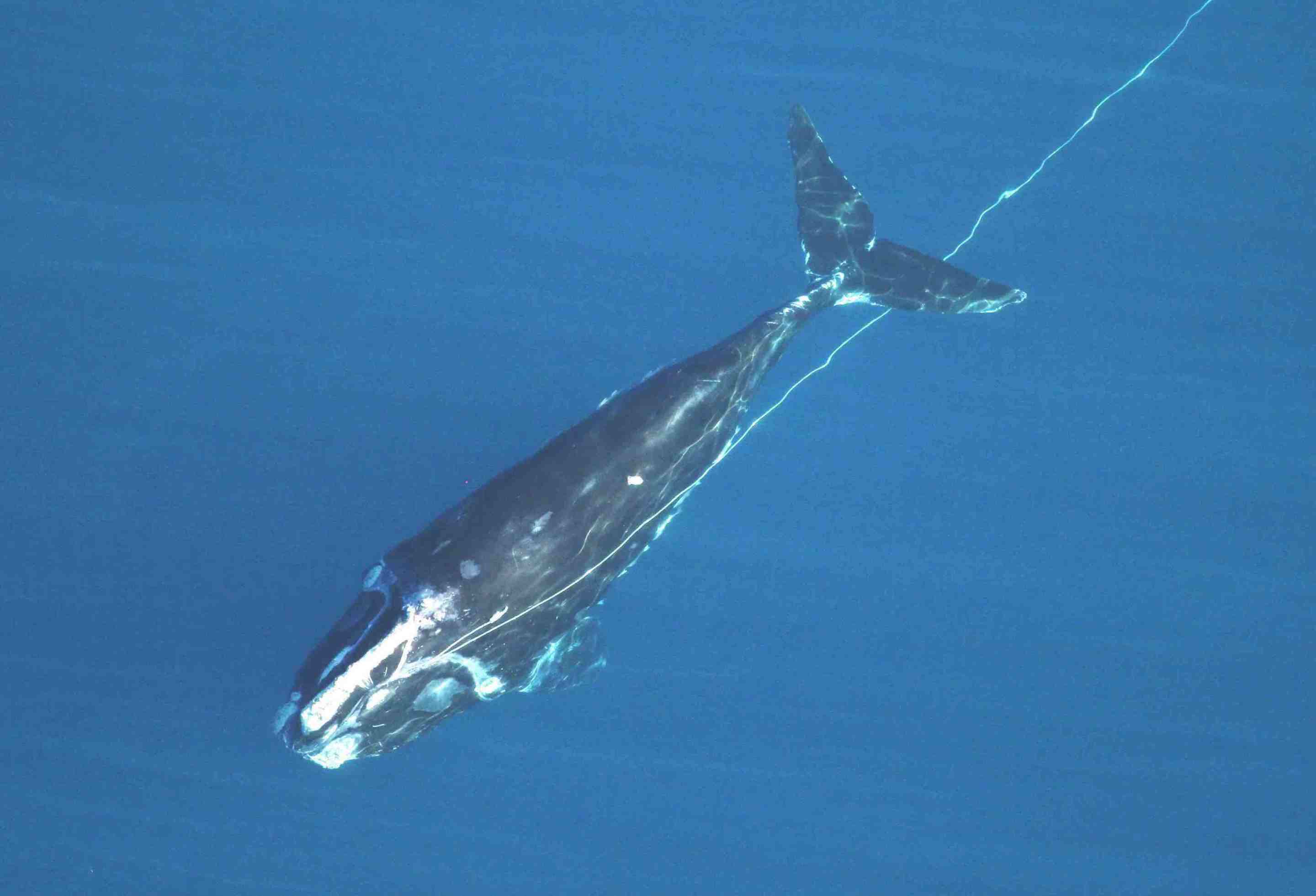 Lead image: A male right whale entangled in heavy fishing rope off the coast of Florida. Biologists were able to remove the rope. Credit: Florida Fish and Wildlife Conservation Commission, taken under NOAA research permit #15488.